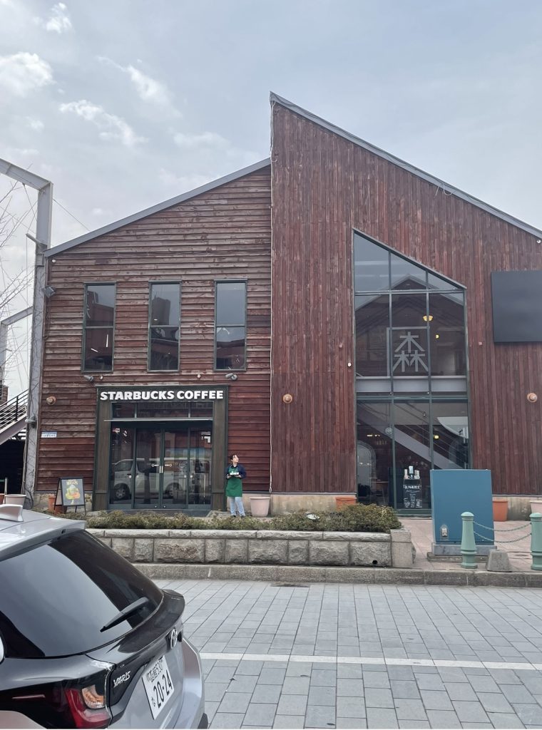(お気に入り)港近くには、「スタバ」「コメダ珈琲」などいくつかのカフェがあります。私たちのお気に入りは、海に面した「スタバ」です。木目調の2階建てで落ち着いた雰囲気でゆったりできます。