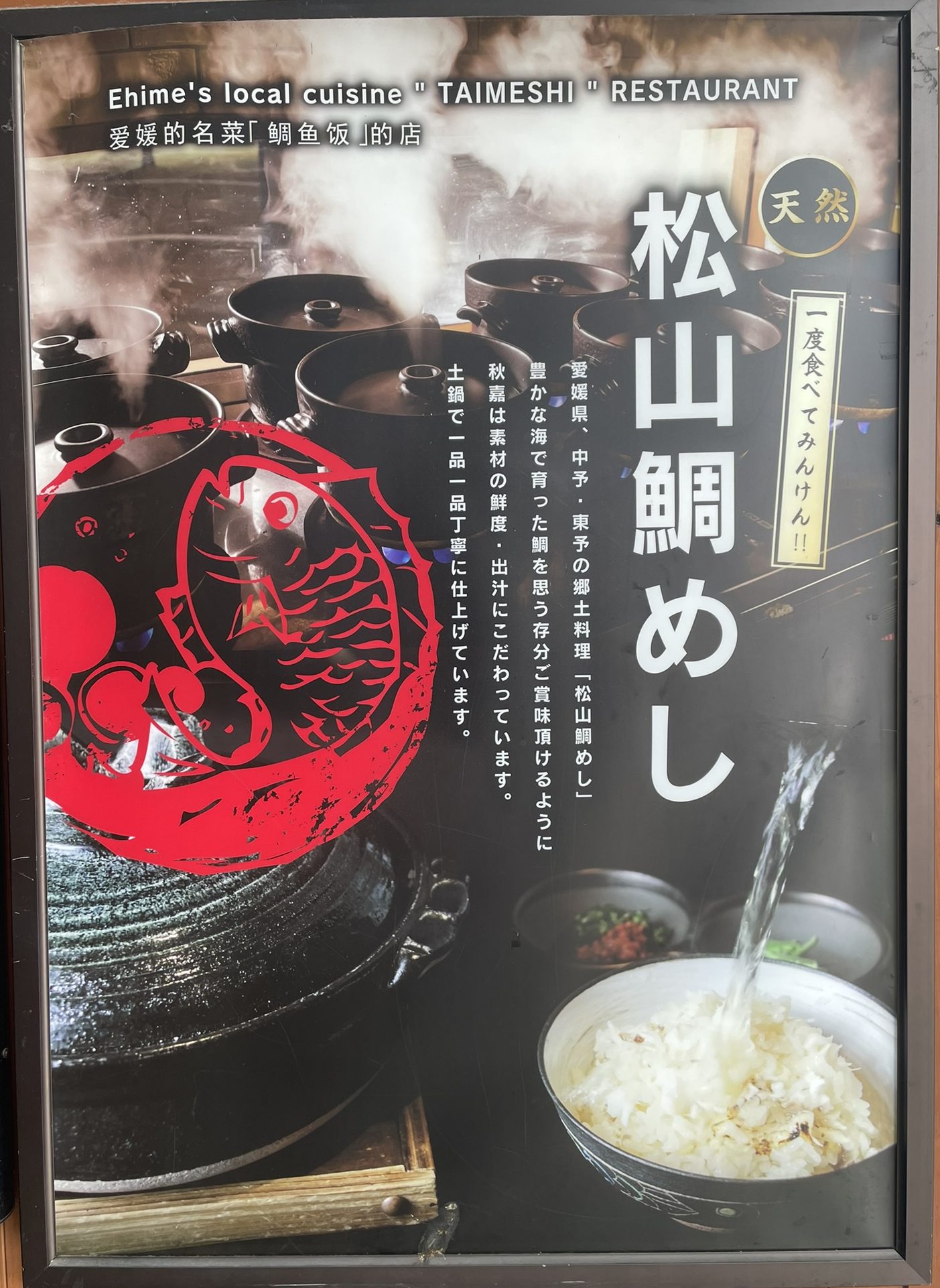 松山城へのロープウェイ乗り場への道沿いや道後温泉のハイカラ通りには沢山の鯛めし屋さんがありました。