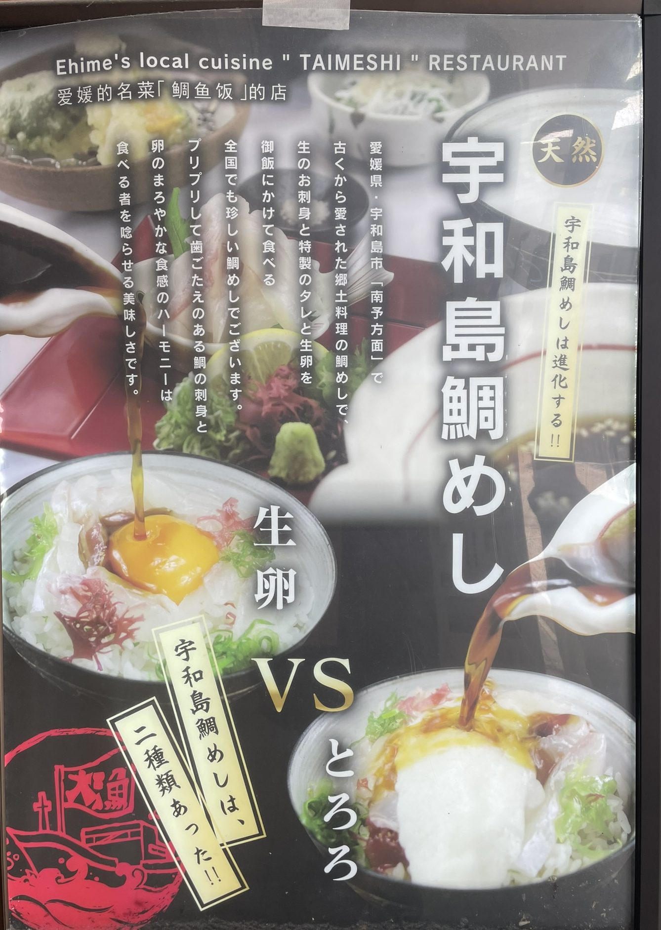 宇和島鯛めしの専門店です。天然の鯛、養殖の鯛、両者の食べ比べが選べます。天然の鯛を食べましたが、とても美味しかったです。