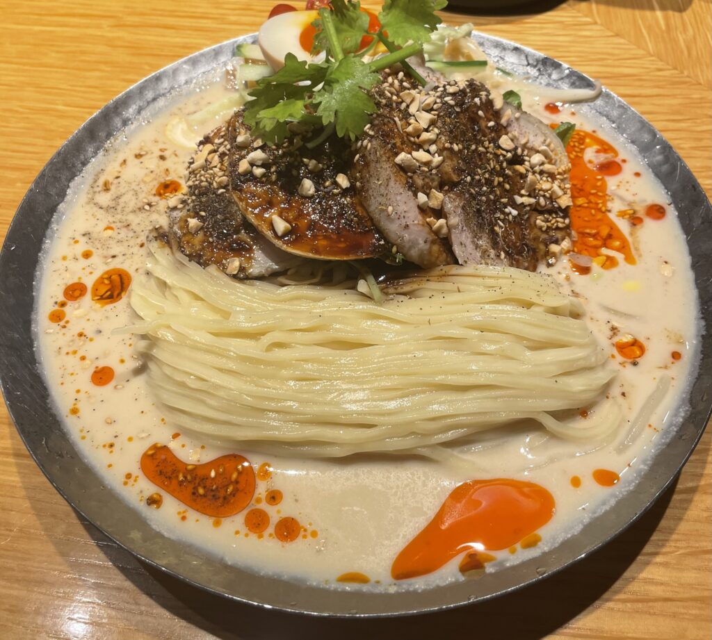 九段北にある「二階堂」は、夏限定の「よだれ鶏豆乳冷やし担々麺」で評判のお店です。滑らかな豆乳ベースのスープはピリ辛で、ストレート麺にしっかり絡みます。トッピングにはジューシーなよだれ鶏やパクチー、豆もやし、ミニトマトなど彩り豊かな具材が満載。さらにピーナッツとゴマの香ばしいアクセントが味わいを引き立てます。