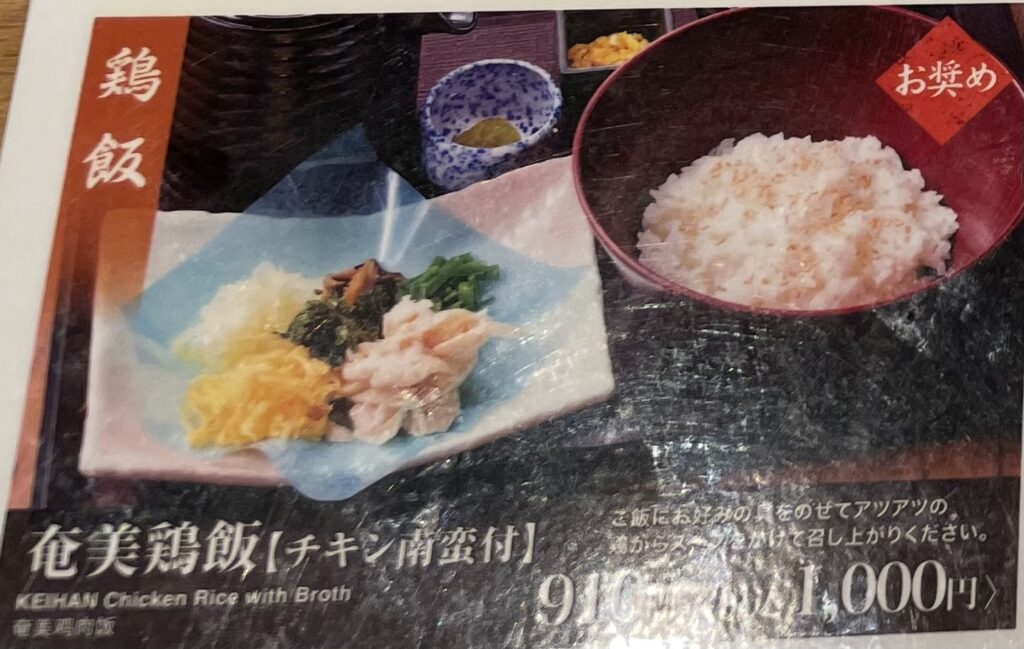 今日は、奄美鶏飯を食べに来ました。奄美鶏飯は、奄美の郷土料理で、おいしい具材を鶏スープで楽しむ一品で炊きたてのご飯に蒸し鶏、錦糸卵、シイタケ、たくあんなどを乗せ、熱々のスープをかけて食べます。