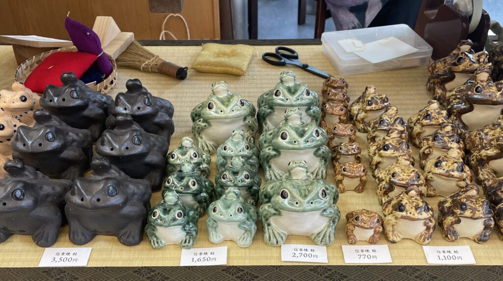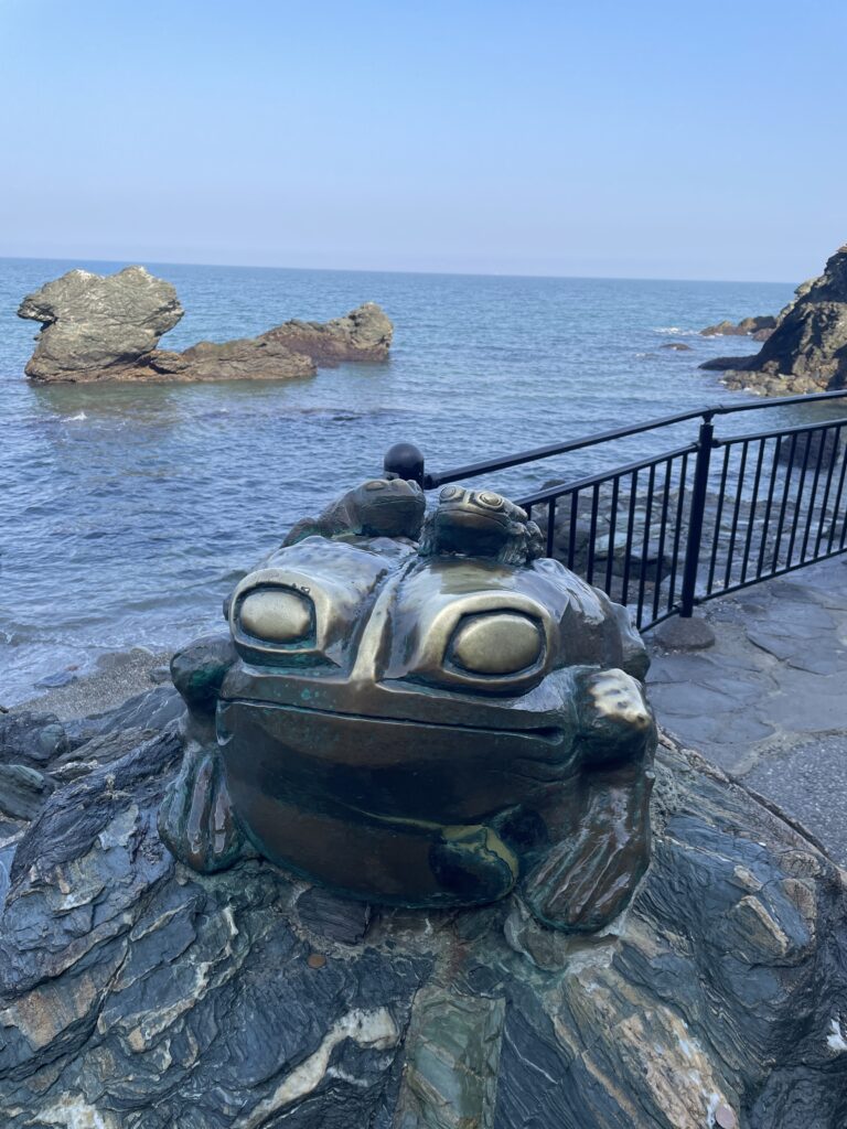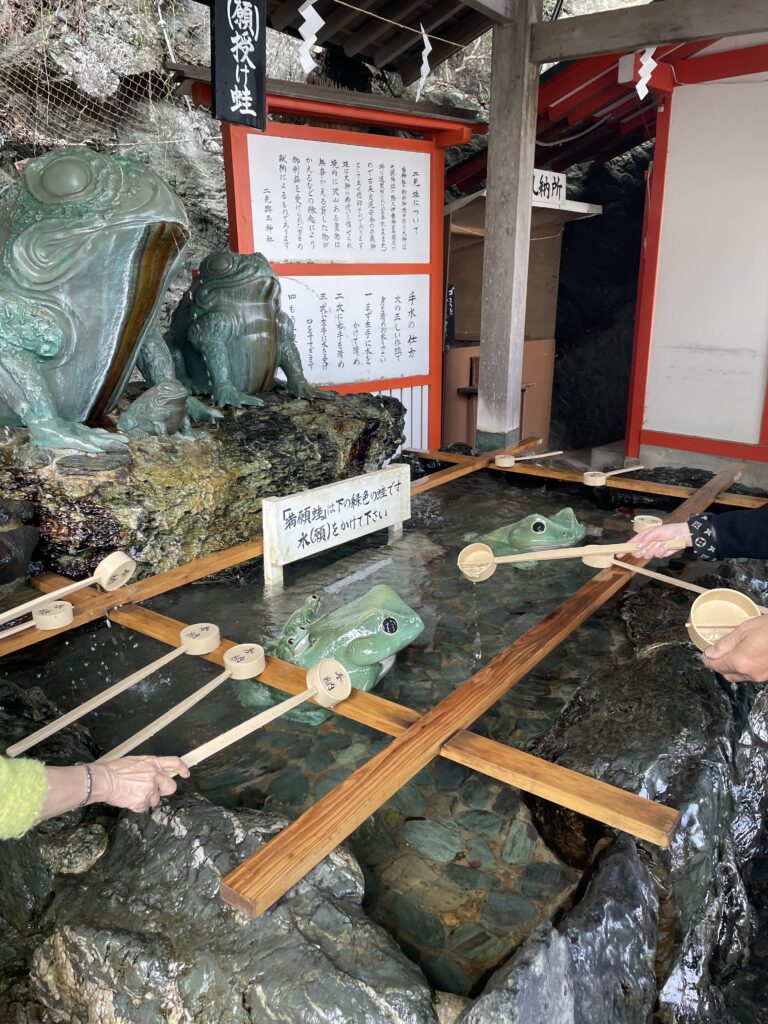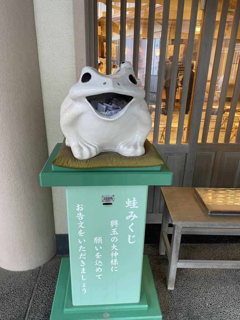 御祭神・猿田彦大神の使いとされる「二見蛙」の献納品が境内の至る所に置かれています。「無事カエル」「貸したものがカエル」といった願いが込められており、独特の風景を作り出しています。