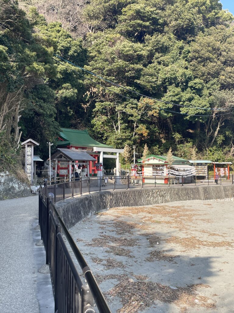 海面に並ぶ大小2つの岩は、沖合約700mの海中に沈む御神石「興玉神石」と、日の出を拝むための鳥居の役割を果たしています。大注連縄で結ばれた姿は「夫婦円満」や「良縁」の象徴として親しまれ、5月〜7月頃には岩の間から昇る美しい日の出を拝むことができます。