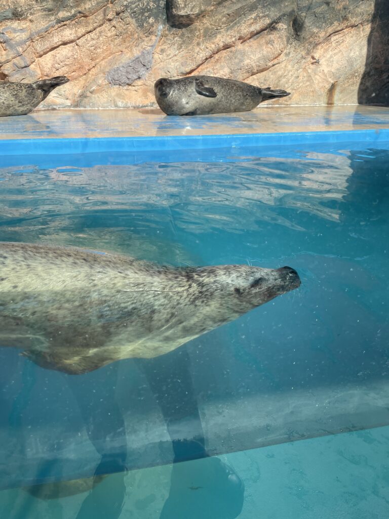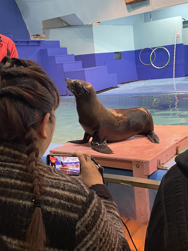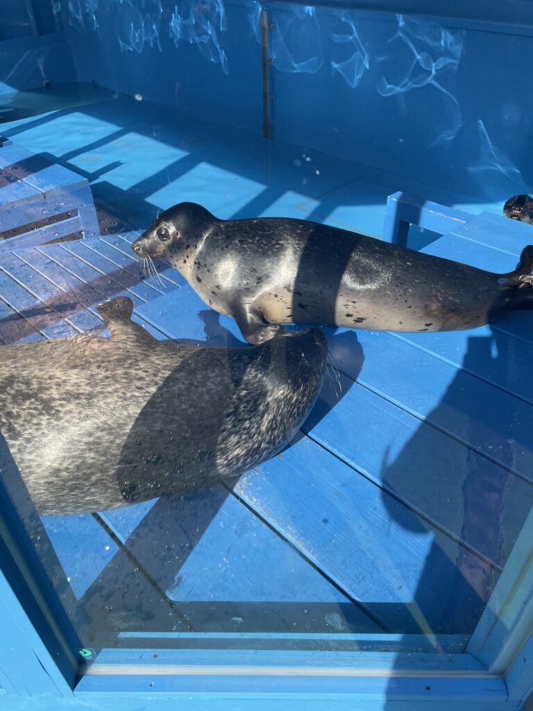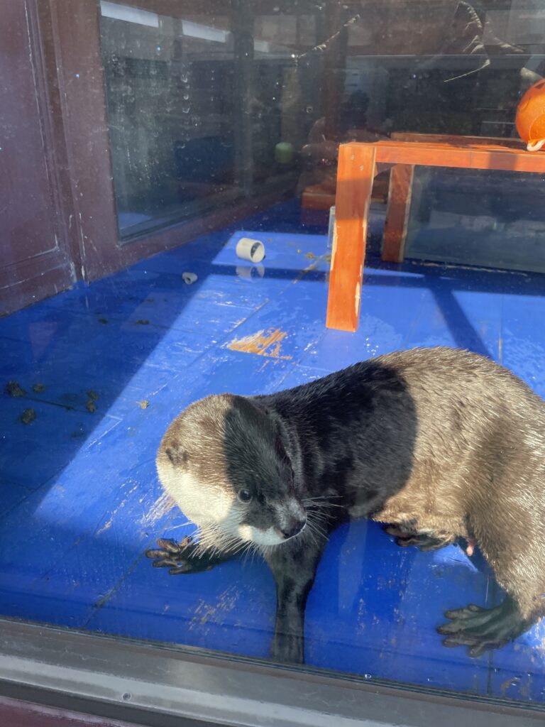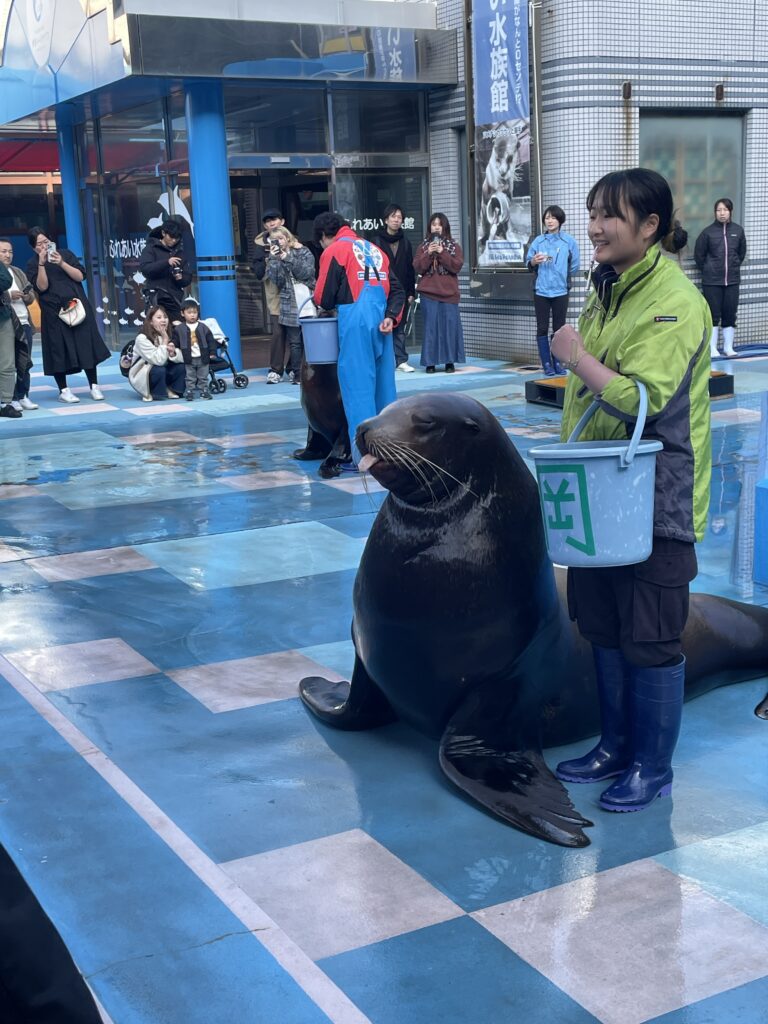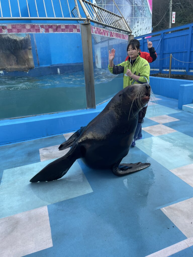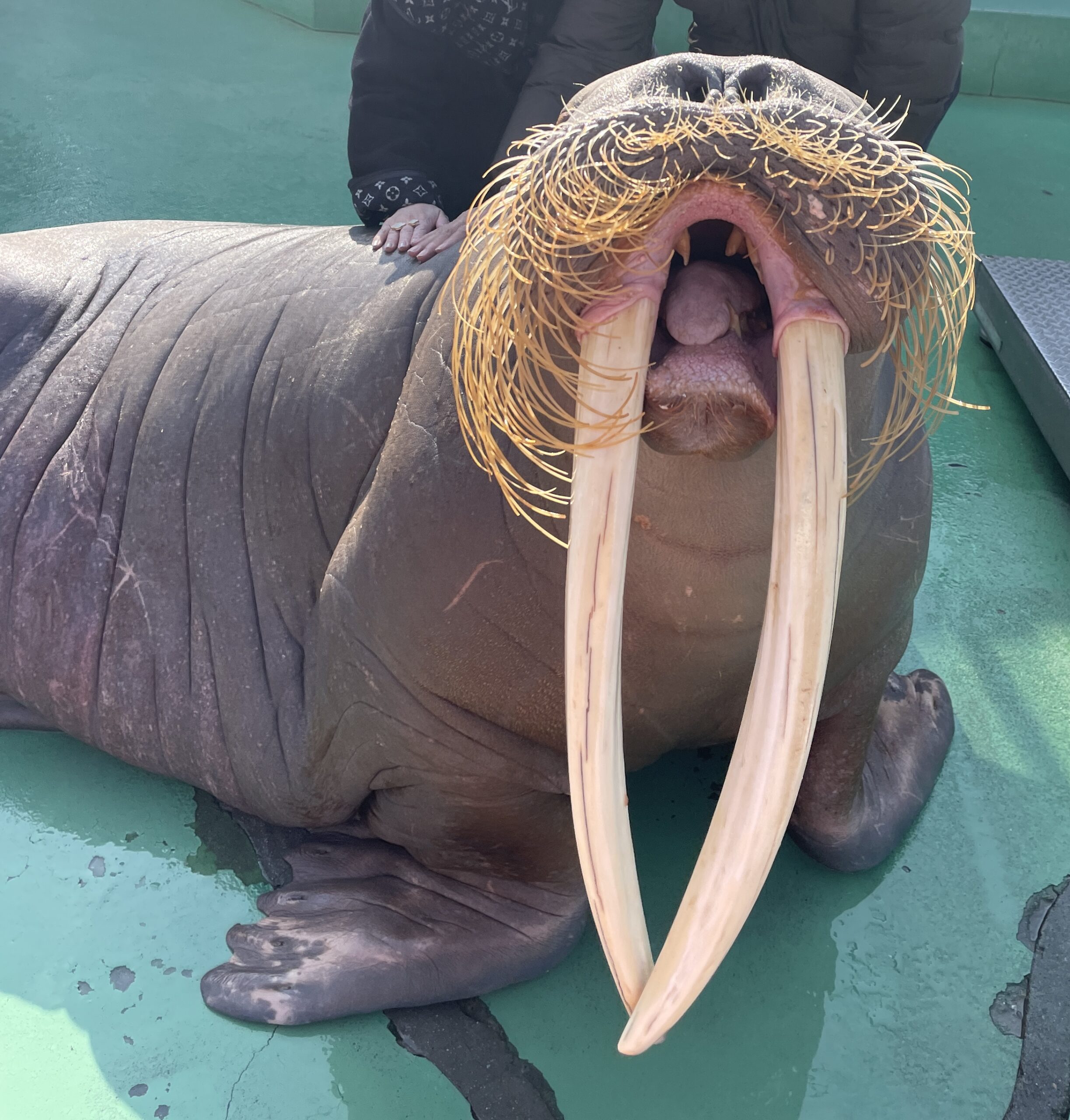 今回は、セイウチと記念撮影、ツメナシカワウソとの握手を体験できました。午前中は、トドとのふれあいがあったようです。