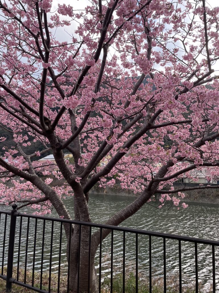 「河津桜まつり」の期間中(2月)は非常に混み合いますが、温泉宿に宿泊すれば、早朝の静かな桜並木を独占できます。